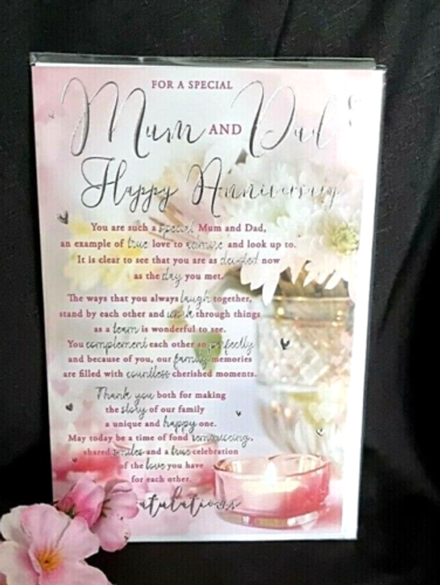Make your mum and dad's special day even more memorable with this stunning anniversary card from Kingfisher Cards Ltd. Measuring 9"x6", this premium quality card features beautiful silver foil accents that add a touch of elegance and sophistication. The sentiment verse is sure to tug at their heartstrings, making it the perfect way to show your love and appreciation. Whether they're celebrating 10, 25, or 50 years together, this specially popular card is the ideal choice for anyone who wants to express their love in a meaningful way. Each card is sealed with a loving wish, making it a thoughtful and personal gift they'll treasure for years to come.