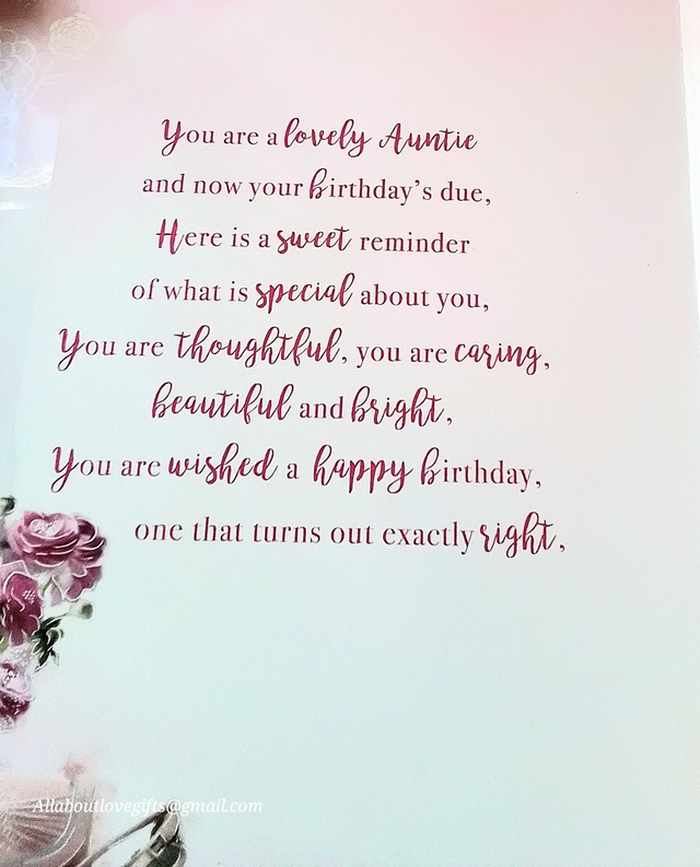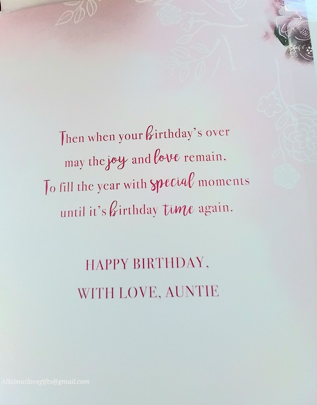 Celebrate your special auntie with this stunning quality card from Kingfisher Cards Ltd. Measuring approximately 15.2 cm x 22.8 cm, this beautifully foiled card features an elegant “To A Special Auntie” sentiment verse, making it perfect for expressing love and appreciation. Crafted with premium materials, the Aura card offers a luxurious finish that stands out, ideal for those seeking a heartfelt and stylish greeting. Whether it’s for birthdays, thank-yous, or just because, this card is especially popular for anyone wanting to send a loving message. Brighten your auntie’s day with a memorable, high-quality card that truly speaks from the heart.