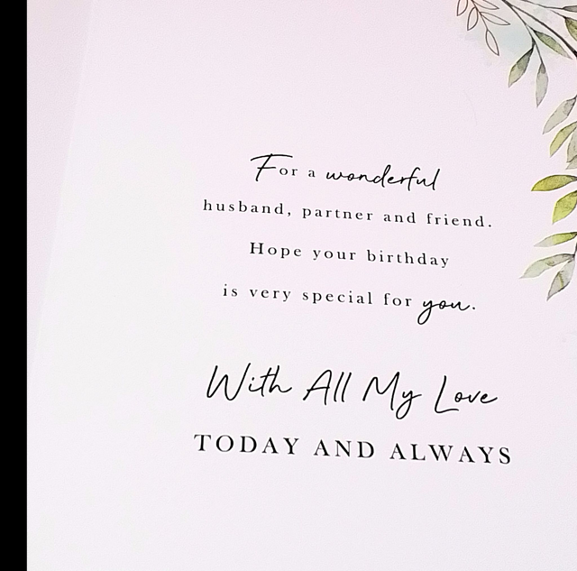 Celebrate your husband’s special day with this stunning Husband Birthday Card, measuring 23x15cm. Crafted with high-quality materials, this beautifully designed card features an elegant, heartfelt sentiment perfect for expressing your love and appreciation. Its generous size offers ample space for a personal message, making it an ideal choice to convey your warmest birthday wishes. Whether paired with a gift or given alone, this card adds a thoughtful touch to any birthday celebration. Show your husband just how much he means to you with a card that’s meaningful, stylish, and memorable. Perfect for making his birthday truly unforgettable!
