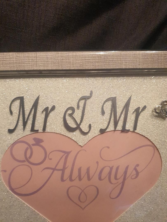 Celebrate love with our Mr and Mr wedding photo frame, hand-decorated with intricate embellishments. This unique frame is perfect for displaying cherished memories of your special day. The sentiment words "love always" add a heartfelt touch to this beautiful piece. Whether it's a gift for a same-sex couple or a keepsake for yourself, this frame is a stunning addition to any home. Show your support for love in all its forms with this sentimental and stylish photo frame.