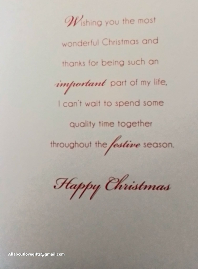 Express your love this holiday season with our Stunning Christmas Card designed especially for your wife. Featuring a beautifully crafted design that captures the warmth and joy of the season, this card is perfect for conveying heartfelt messages of love and appreciation. Printed on premium-quality cardstock, it offers a luxurious feel and lasting keepsake she’ll cherish. Ideal for gifting alongside presents or as a standalone expression of your affection, this card makes your Christmas wishes truly memorable. Personalize your message to make it uniquely hers. For custom orders or inquiries, contact us at allaboutlovegifts@gmail.com. Celebrate your love story with a card as stunning as she is!